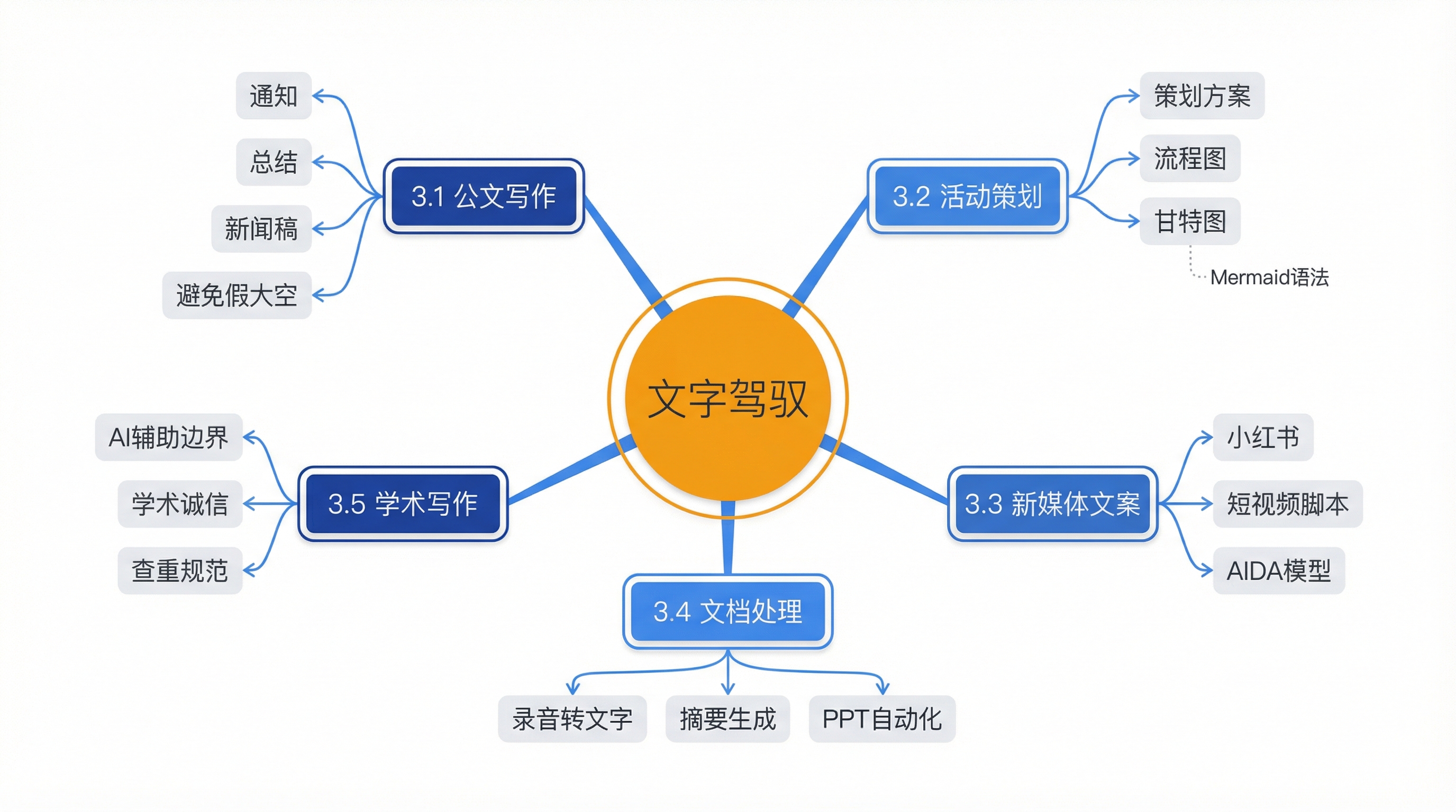 | 3.1 公文与日常写作 | 利用 AI 生成规范的通知、新闻稿和工作总结,通过提示词约束避免”假大空” | 公文规范、提示词约束 |