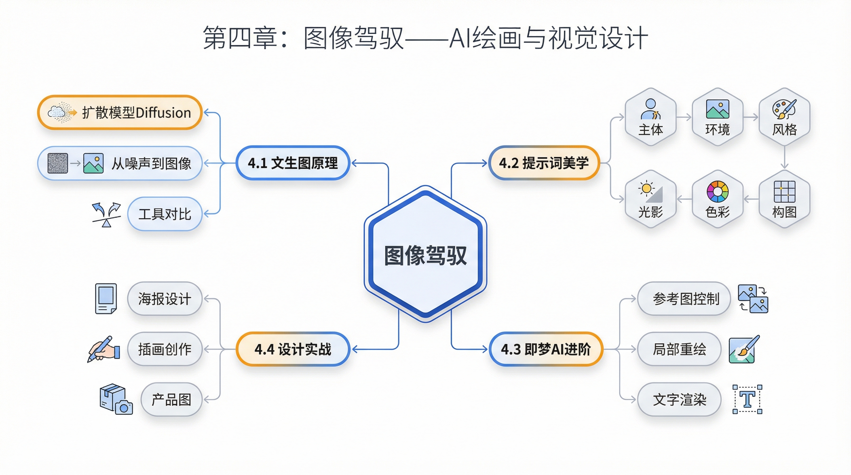 本章从文生图技术原理讲起,建立系统化的视觉提示词方法论,并通过即梦 AI 的进阶操作和平面设计实战,帮助读者从”随机出图”升级为”精准控图”。学习 AI 绘画的过程,也是一次视觉素养的系统提升。