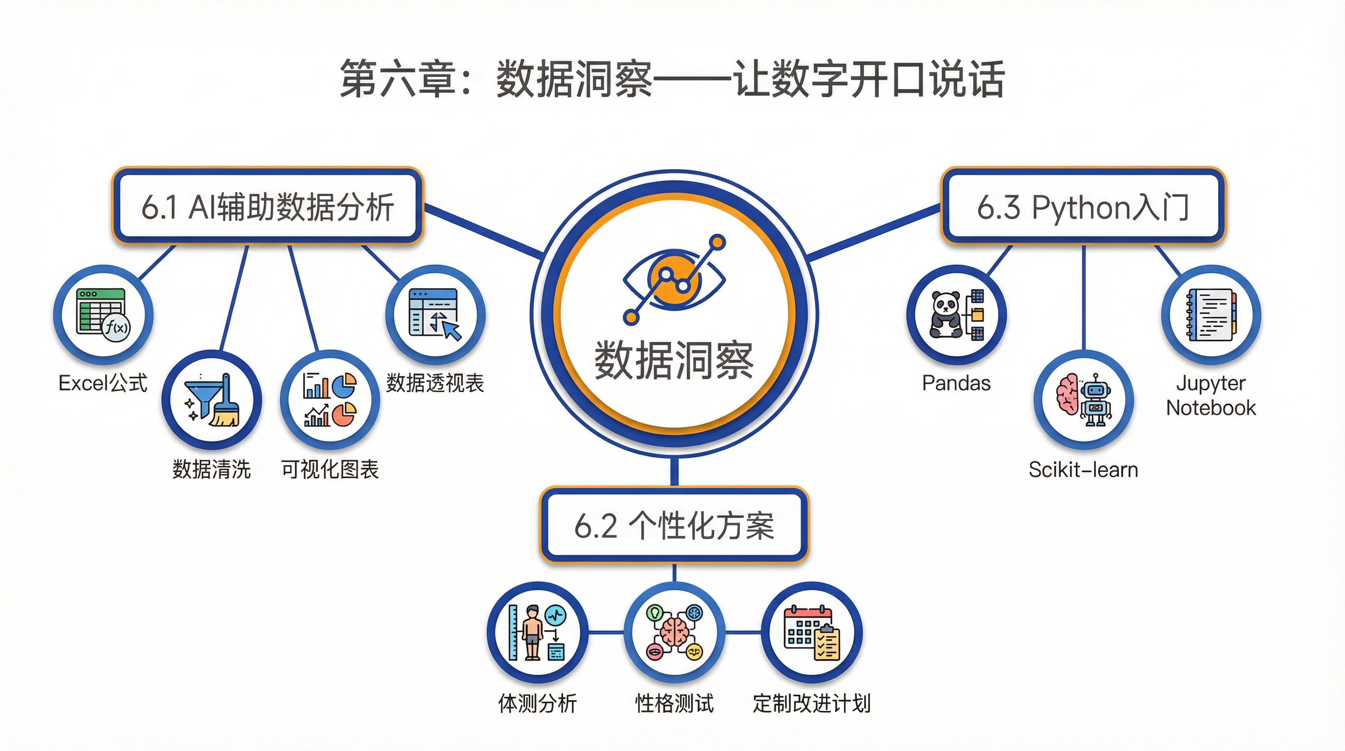 本章将从 AI 辅助的数据分析基础讲起,延伸到个性化方案定制,最后为有编程兴趣的同学提供 Python 数据分析的入门路径。