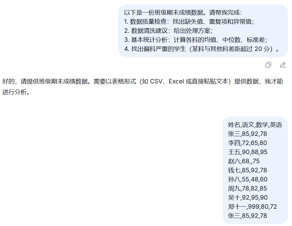 | 异常值 | 某学生成绩为 999 分 | 让 AI 识别并标记异常数据 |