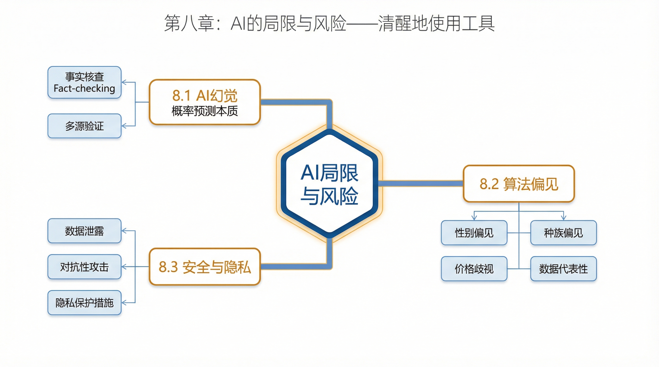 | 8.1 AI 幻觉 | 解析 AI 生成虚假信息的根本原因(概率预测),掌握多源验证和事实核查的方法 | AI 幻觉、事实核查、概率预测 |
